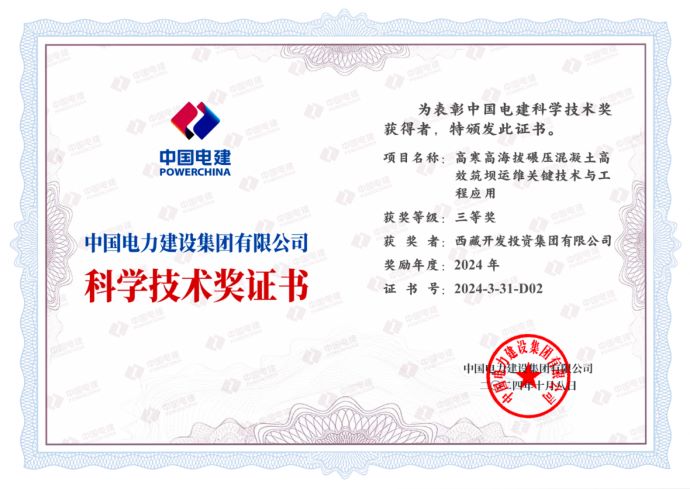 日前,中國電建集團(tuán)公布了2024年度中國電建科學(xué)技術(shù)獎(jiǎng)獲獎(jiǎng)項(xiàng)目名單,西藏開投集團(tuán)果多水電站創(chuàng)新成果——“高寒高海拔碾壓混凝土高效筑壩關(guān)鍵技術(shù)與工程應(yīng)用”榮獲中國電建科學(xué)技術(shù)獎(jiǎng)三等獎(jiǎng)。