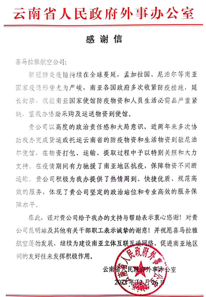 云南省人民政府外事辦向喜馬拉雅航空公司發(fā)來(lái)感謝信