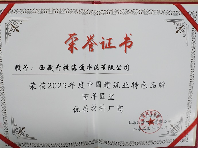 近日,西藏開投海通水泥有限公司榮獲2023年度中國建筑業(yè)特色品牌百年匠星優(yōu)質(zhì)材料廠商榮譽稱號。