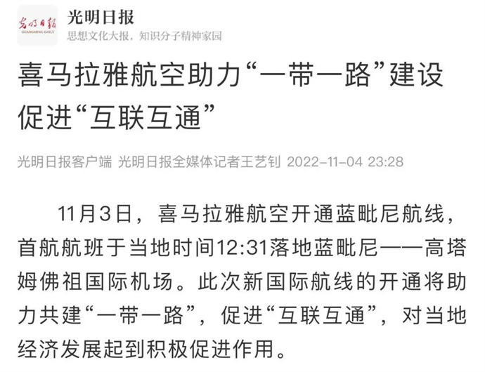 中華網(wǎng)、中國網(wǎng)、中企網(wǎng)、中國日報、光明日報、中國旅游新聞網(wǎng)、中國西藏新聞網(wǎng)、拉薩新聞網(wǎng)等媒體報道喜航開通加德滿都至藍(lán)毗尼航線