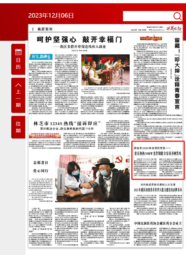 編者按:12月5日,西藏日?qǐng)?bào)第二版高原要聞欄目報(bào)道了《那曲市2023年度保供項(xiàng)目—索縣熱熱50MW光伏儲(chǔ)能全容量并網(wǎng)發(fā)電》文章。全文如下: