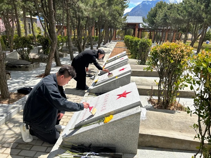林芝市烈士陵園修建于1999年,共安葬烈士99名。這些革命烈士是在和平解放西藏、民主改革、中印自衛(wèi)反擊戰(zhàn)及社會(huì)主義建設(shè)時(shí)期,為保衛(wèi)國家和人民生命英勇犧牲的,為解放和發(fā)展西藏、保衛(wèi)邊疆、建設(shè)林芝做出了不朽的功勛,獻(xiàn)出了寶貴的生命。干部職工帶著對(duì)烈士們無限的緬懷和追思,在烈士墓葬區(qū)向各個(gè)革命時(shí)期英勇犧牲的烈士敬獻(xiàn)花束,并清掃了墓碑。