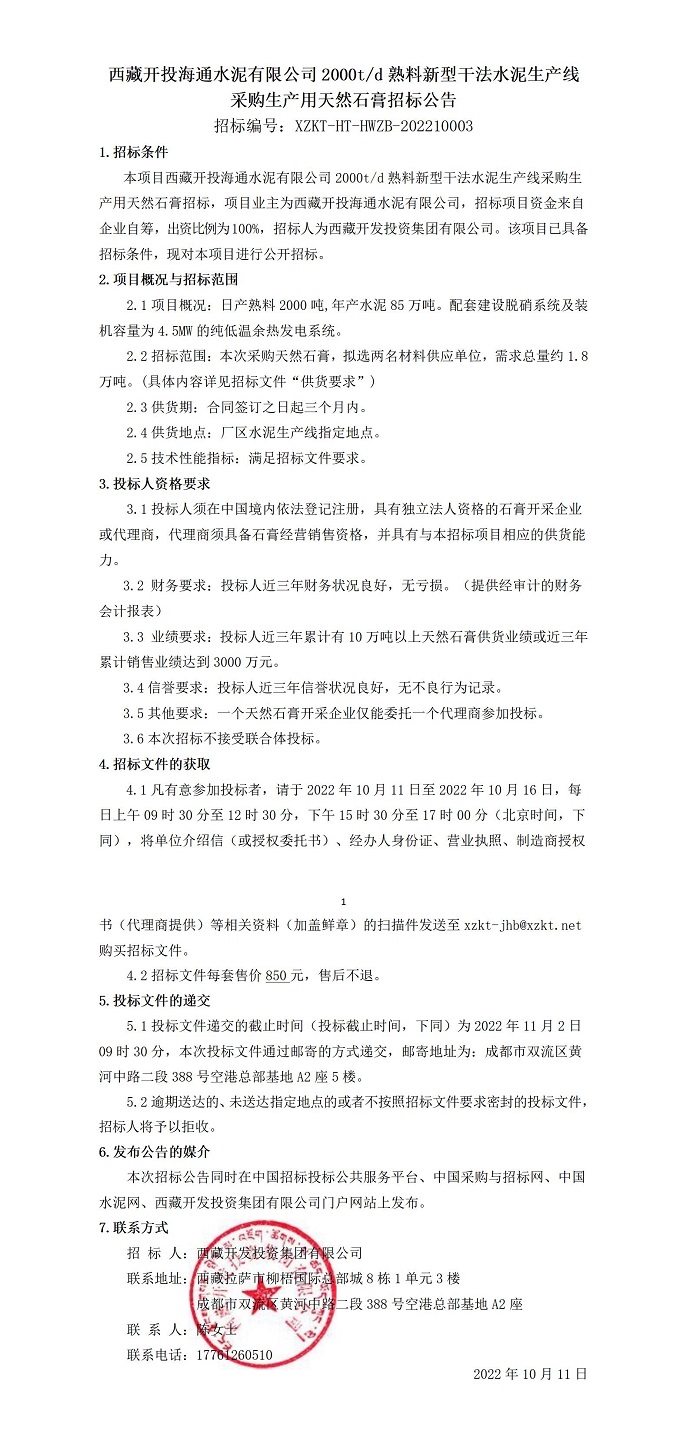 采購生產(chǎn)用天然石膏招標公告