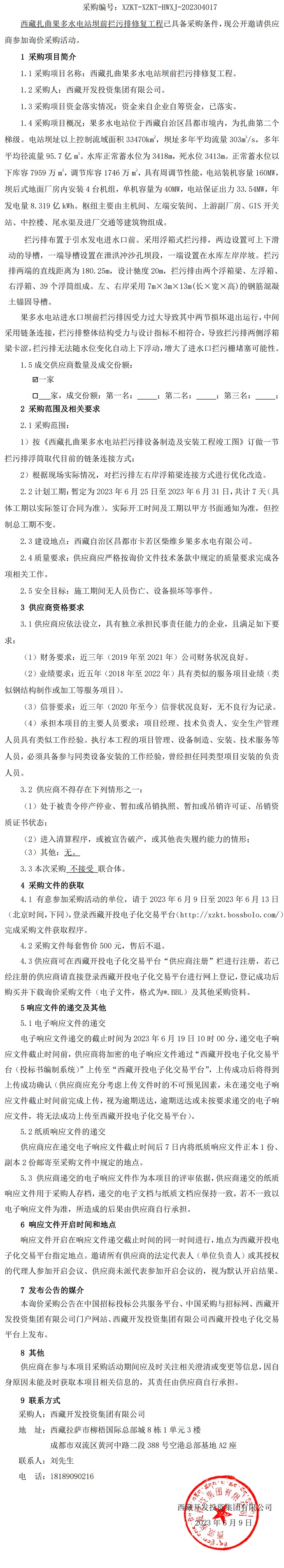 西藏扎曲果多水電站壩前攔污排修復(fù)工程詢價采購公告