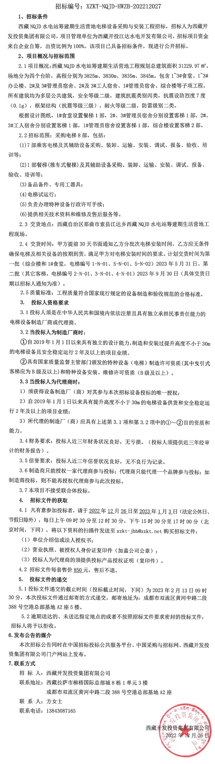 西藏NQJD水電站籌建期生活營地電梯設(shè)備采購與安裝工程