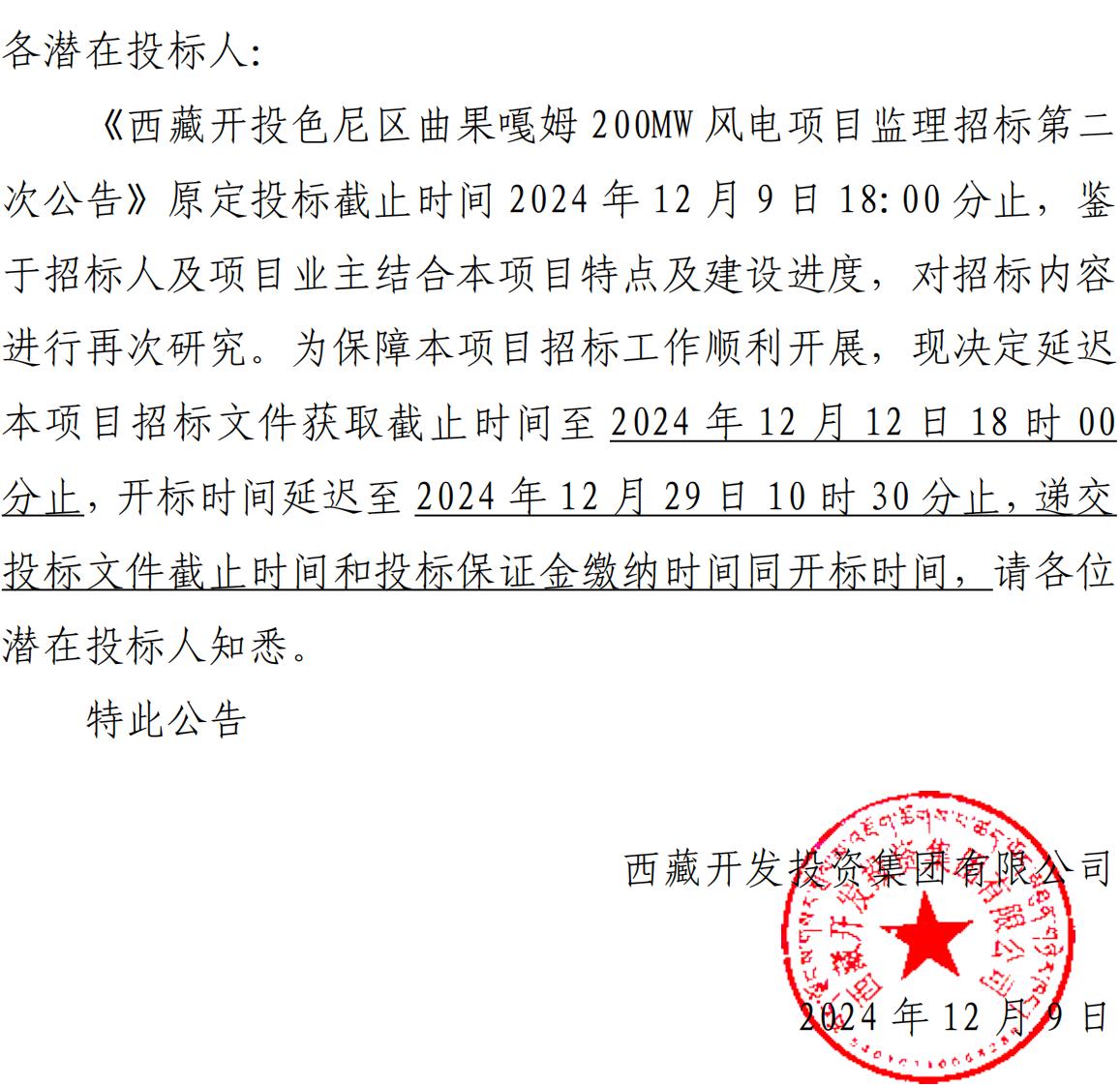 關于延長《西藏開投色尼區(qū)曲果嘎姆200MW風電項目監(jiān)理招標第二次公告》投標截止時間的公告