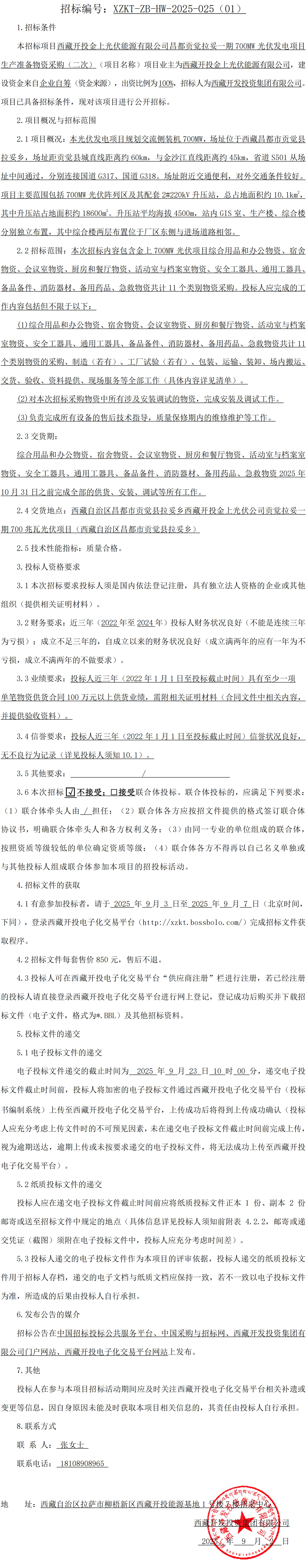 西藏開投金上光伏能源有限公司昌都貢覺拉妥一期 700MW 光伏發(fā)電項(xiàng)目生產(chǎn)準(zhǔn)備物資采購(gòu)(二次)招標(biāo)公告